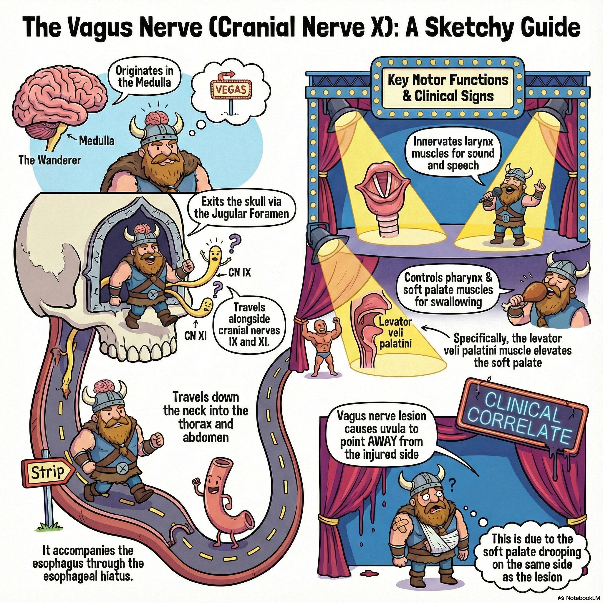 The vagus nerve, or cranial nerve X (CN X), is one of the most extensive and functionally diverse nerves in the human body. Its vast distribution means that a lesion along its path can manifest in a wide variety of clinical signs. For the diagnosing clinician, a clear understanding of its anatomical course—from its origin in the brainstem to its exit from the skull and descent into the torso—is fundamental for accurately interpreting physical examination findings and localizing neurological dysfunction. The anatomical pathway of the vagus nerve begins deep within the brainstem and follows a precise route out of the cranial cavity.