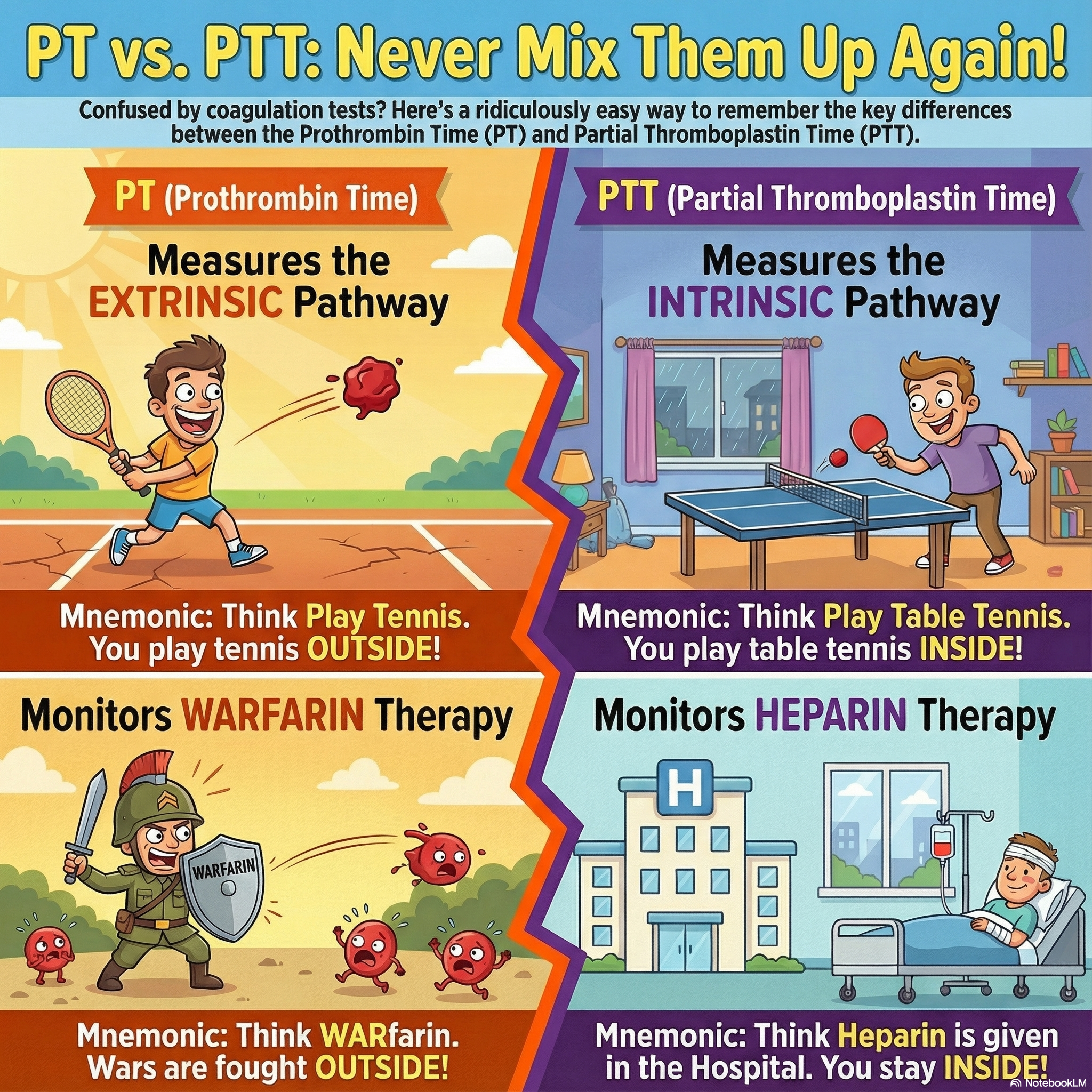 | aPTT | Intrinsic <br> (“Play Table Tennis” / Inside) | Heparin <br> (Given in “Hospital” / Inside) | • Effective Heparin therapy <br> • Clotting factor deficiency (e.g., Hemophilia, von Willebrand disease) |
